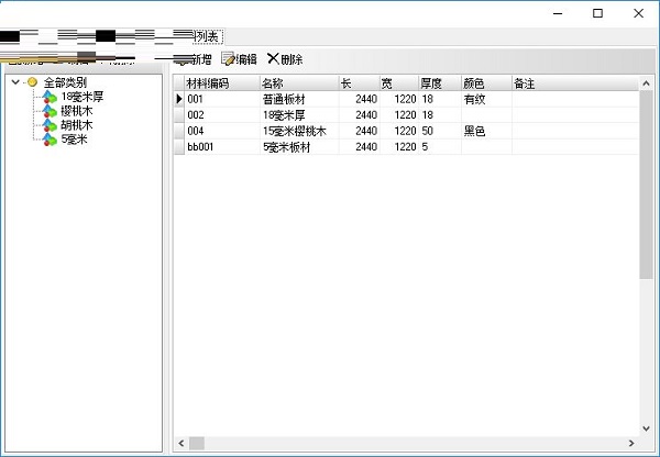 2、物料管理点击新增,可以添加新的材料、支持18毫米厚、樱桃木、胡桃木、材料编码颜色备注