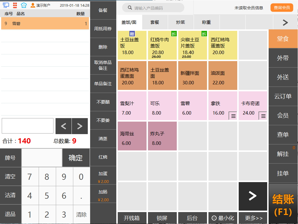 支持牌号发放、挂多单、套餐产品随意更换菜肴等功能。