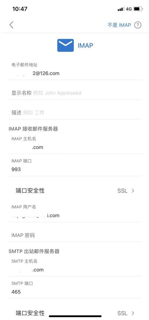 然后,outlook会弹出与该邮箱类型一致的配置文件设置窗口,比如,如图7所示,当前邮箱的类型为IMAP,需输入电子邮件地址、邮件服务器、端口等信息,这类信息一般需要公司的IT部门提供。