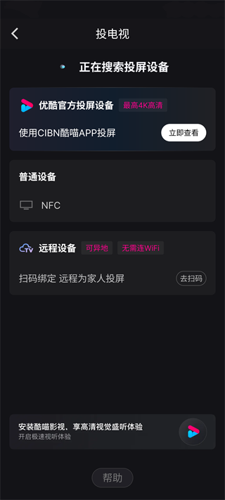 2、如您的电视是Android系统,建议您在电视里下载安装CIBN酷喵影视并打开,再尝试投屏到CIBN酷喵